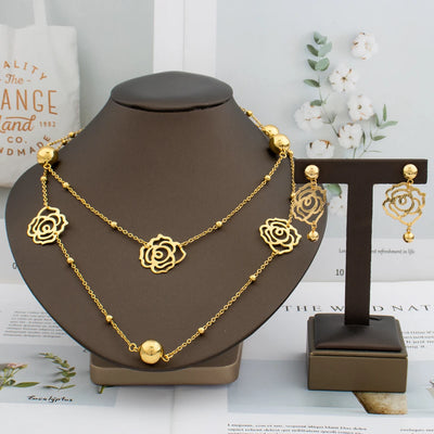 2023 New Dubai Gold Color Bead Chain for Women Rose Flower Earrings Pendant Copper Luxury Necklace Jewelry Set Bride Long Chain