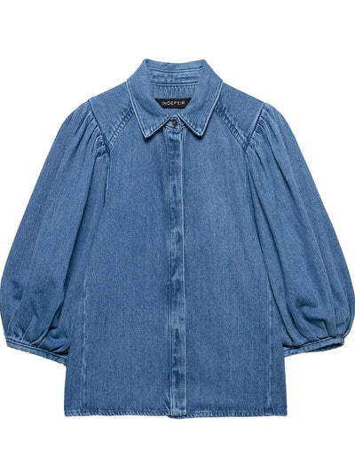 High Waist Wide Leg Denim irt Puffy Sve Turn-down Collar Waed Effect Women's Faion Set Summer 2025 Polyester Long Pa...