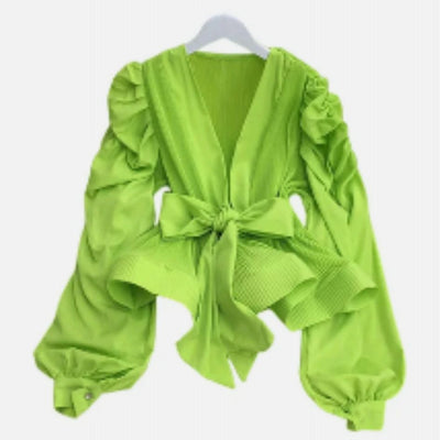 V Neck Lantern Sleeve Jacquard Weave Chiffon Dress