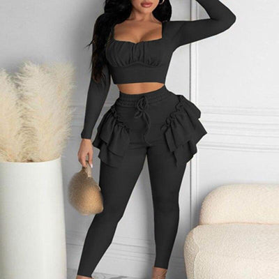 Double Ruffle Outfits Sexy Strapless Long Sleeve Pullover and