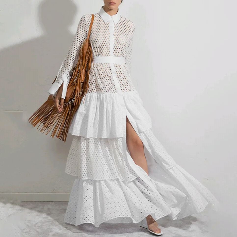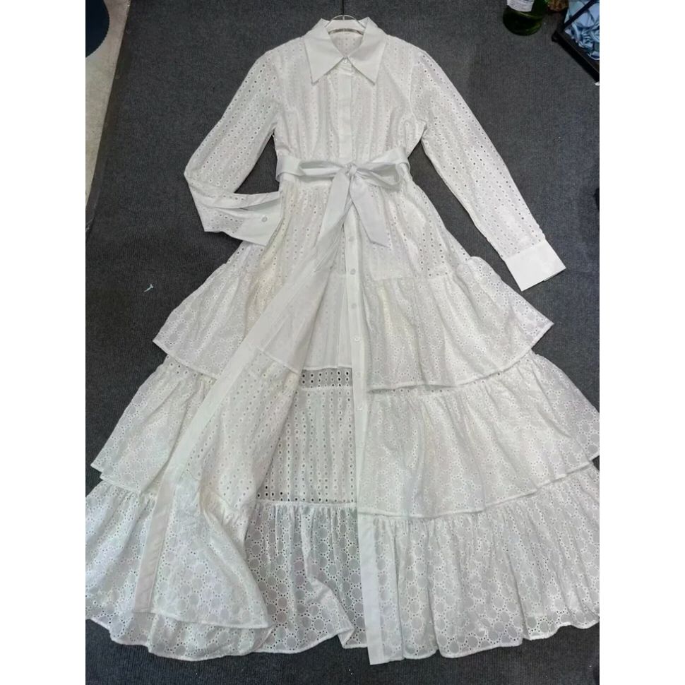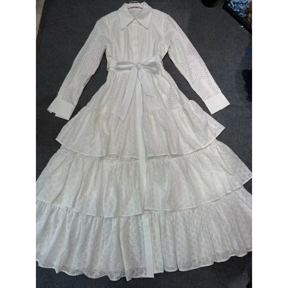 New Autumn New Style Ruffled Hollow Design Waist Slimming Cake White Long Dress
