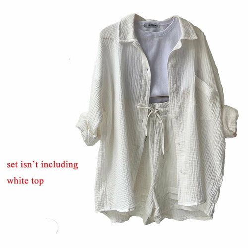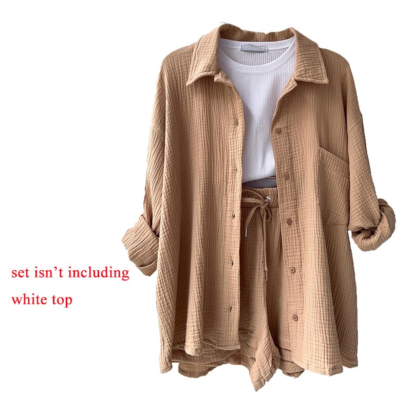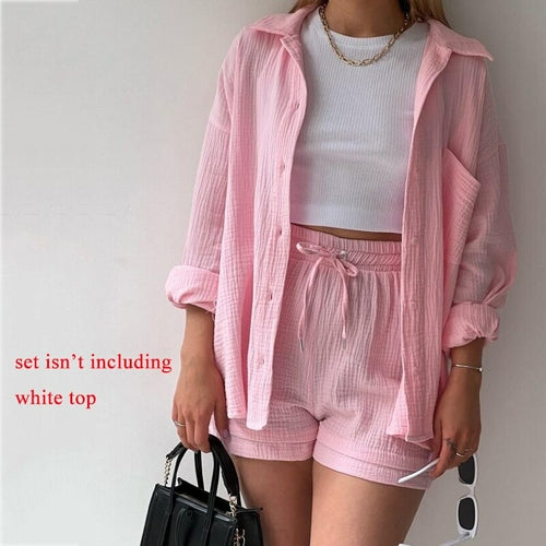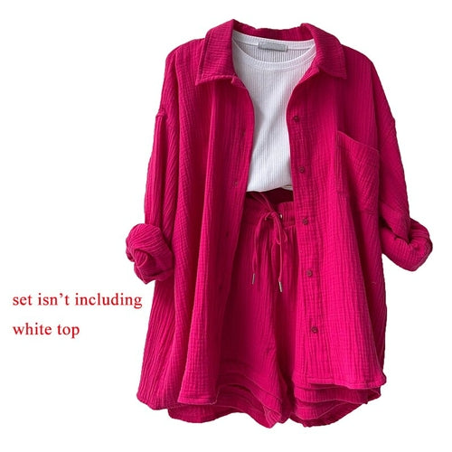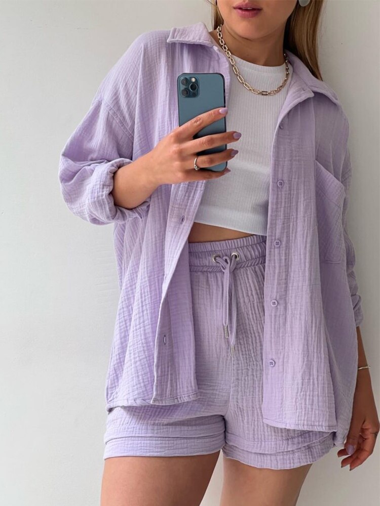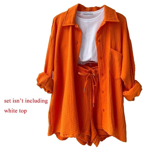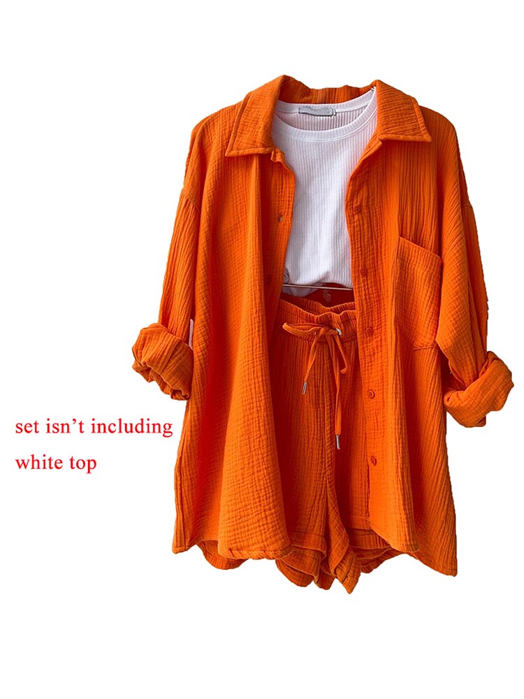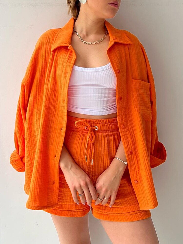 Orange Casual Shirt Shorts Two Pieces Drawstring Tie Up Loose Outfits
