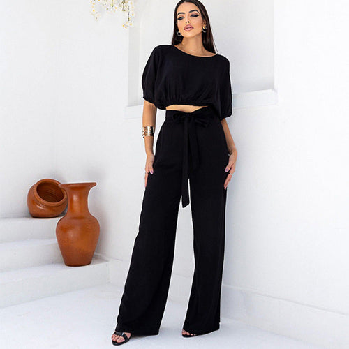 Crew neck short sleeve top lace-up high waist trousers two-piece set