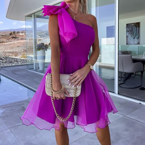 This dress combines comfort and style with its unique skew collar design and patchwork details. Whether you're lounging at home or going out for a casual day, this mini dress is the ideal choice for a laid-back and trendy outfit.