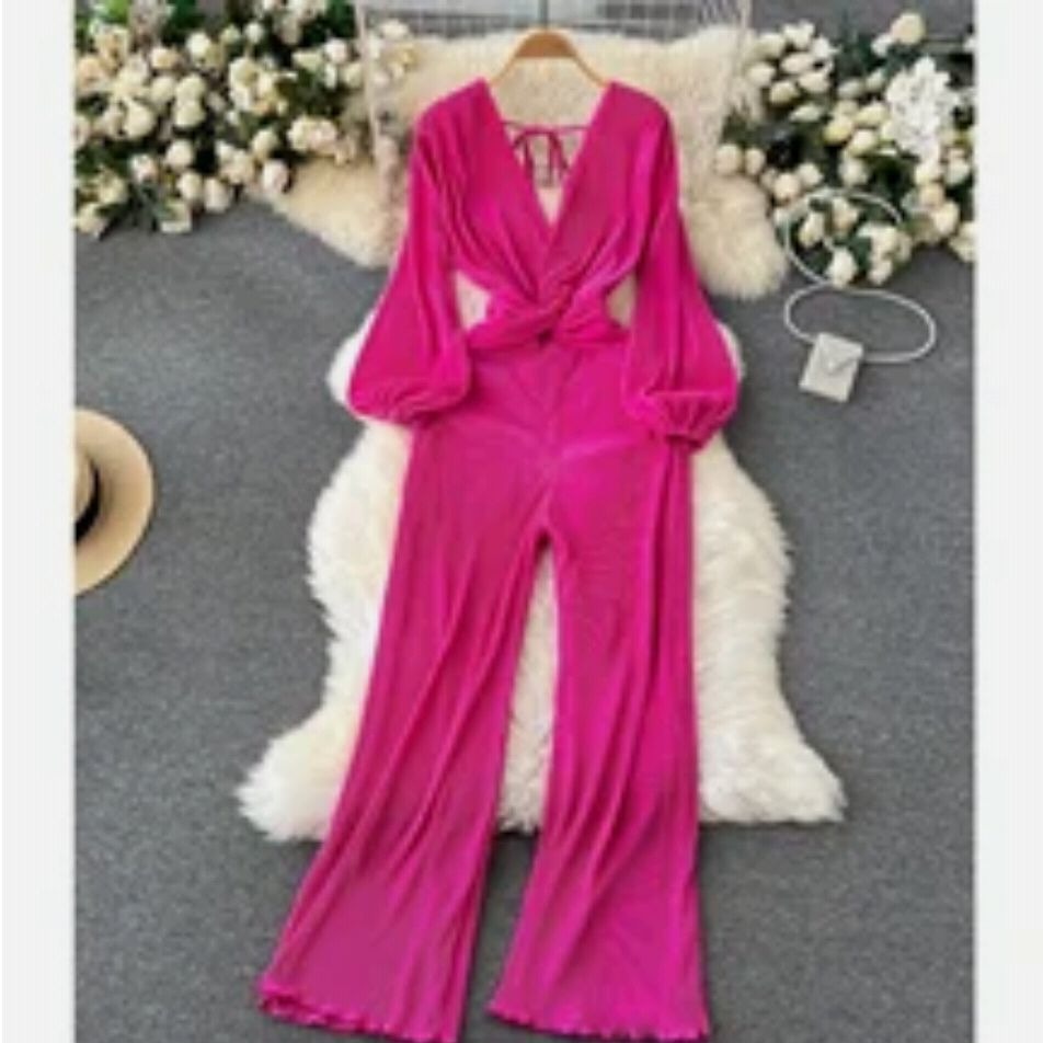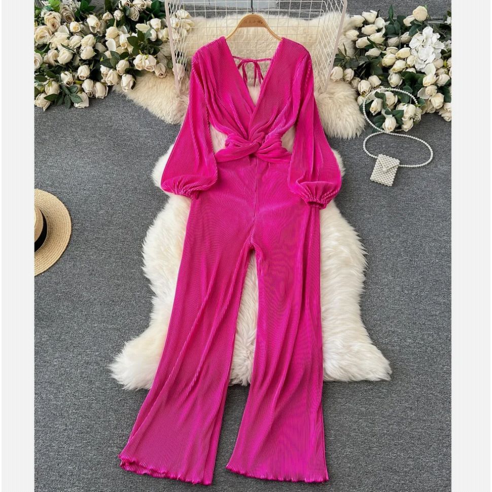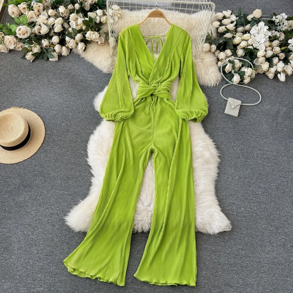 2024 Summer Premium Feeling Long Sleeve V-neck Lantern Sleeve Casual Jumpsuit
