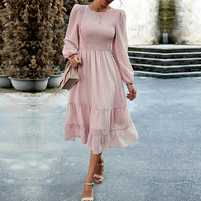 Jacquard Dress Women Autumn O Neck Lantern Sleeve Elegant Solid Color