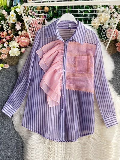 Spring Summer New Fashion Striped Shirt Women's Ruffled Loose