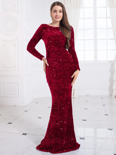 Women Modest Stretch Sequin Royal Blue Evening Prom Gown Party Long