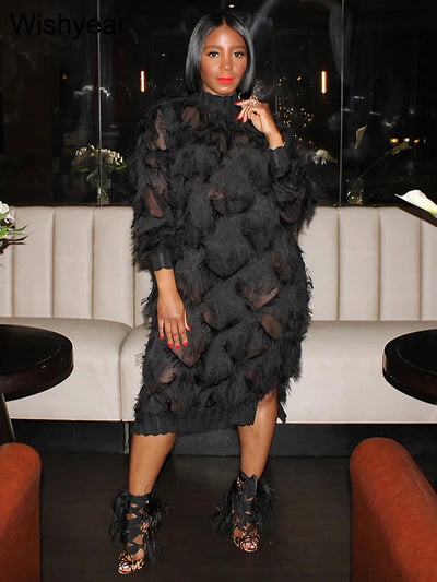 New Spring Chiffon Tassels Lace Ribbed Dress Women Stand Collar Long