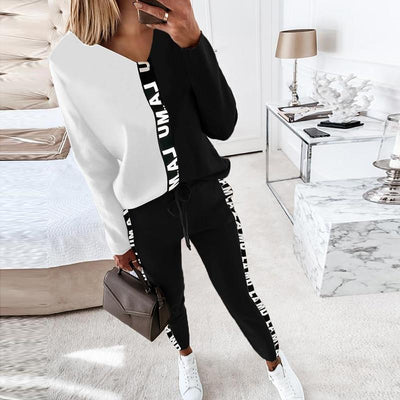 Women Letter Print Spliced Homewear Suits Sexy V-neck Tops Pullover