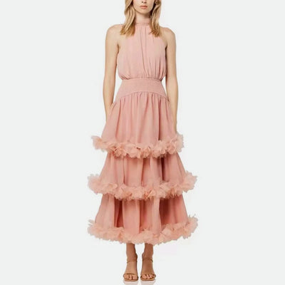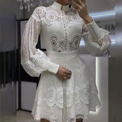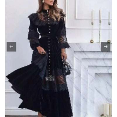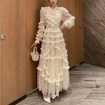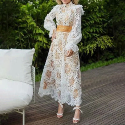 Balloon Sleeve Lace-up High Waist Single Breasted A-line Midi Dress