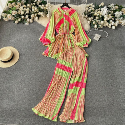 Vintage Button-up Asymmetric Blouses High Elastic Waist Flared Pants