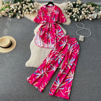 Vintage Women Patchwork Cotton Shirts Sets Summer Beach Ladies Pink