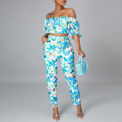 Sexy Floral Print Short Sleeve Off Shoulder Crop Tops + Long Pants