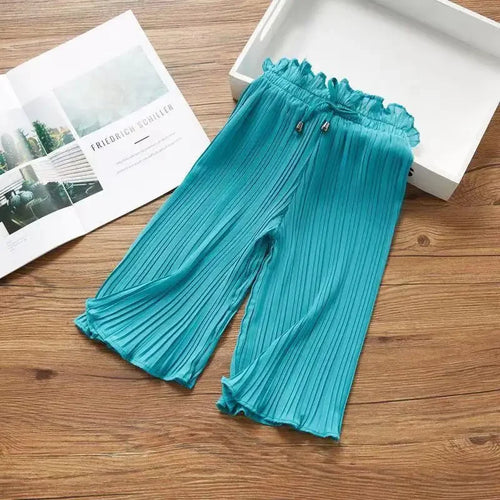 This is a stylish pair of baby fashion lace chiffon waist flare pleated trousers designed specifically for girls, perfect for summer wear. The trousers feature a lightweight chiffon fabric that ensures breathability and comfort in warm weather. The high-waisted design is adorned with a delicate lace detail, adding a touch of elegance. The flared leg design enhances mobility while providing a trendy, chic look. These trousers are ideal for casual outings, parties, or photoshoots, combining practicality with fashionable appeal for your little one.