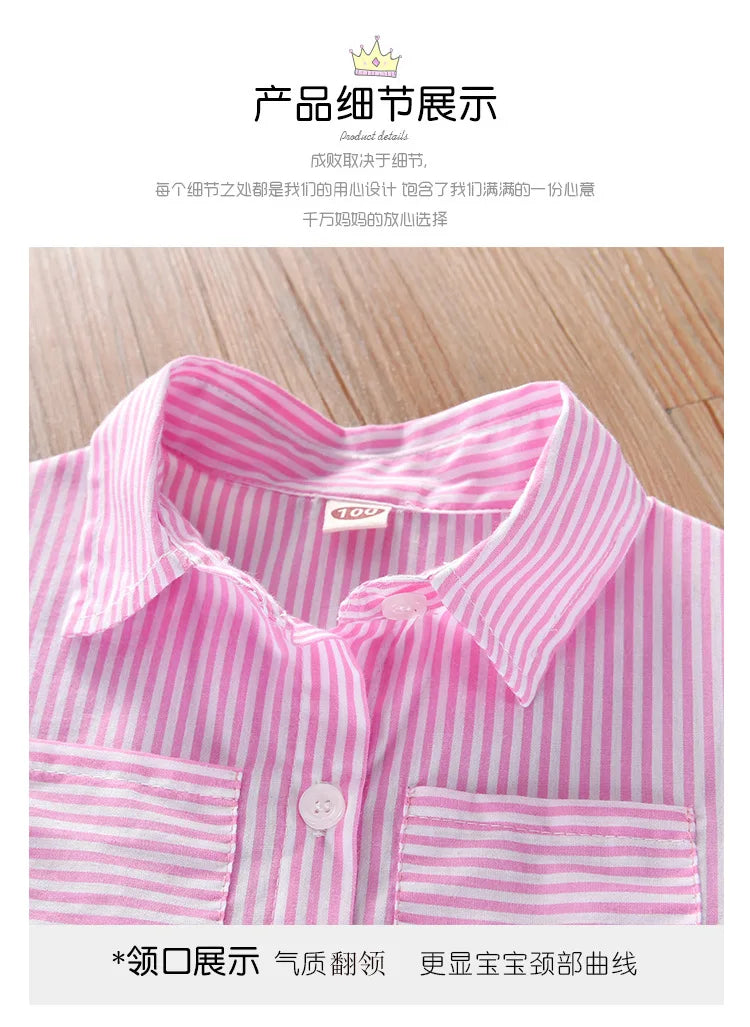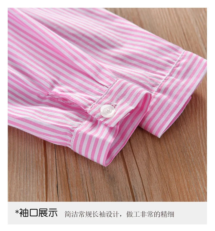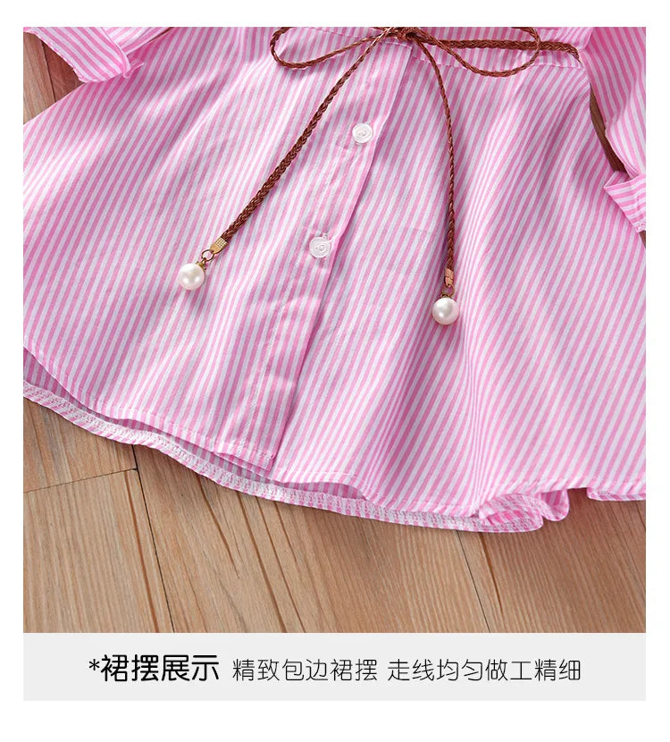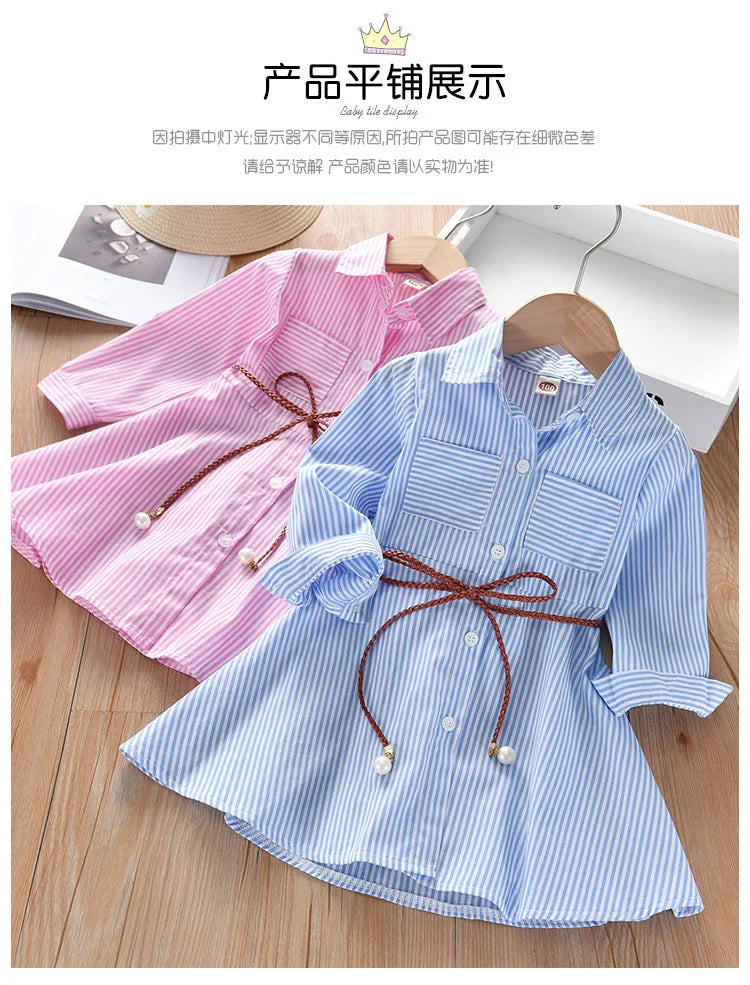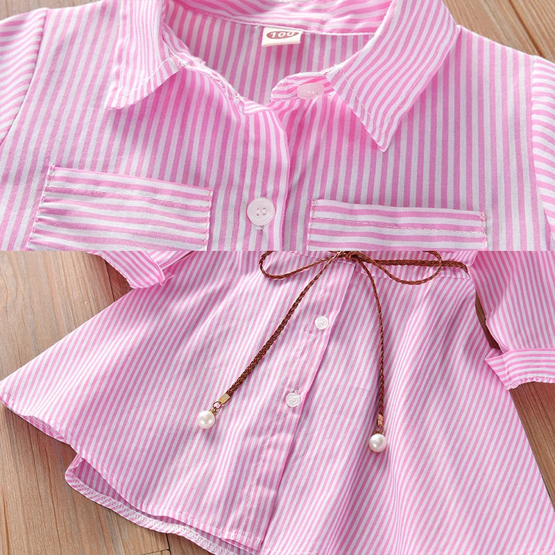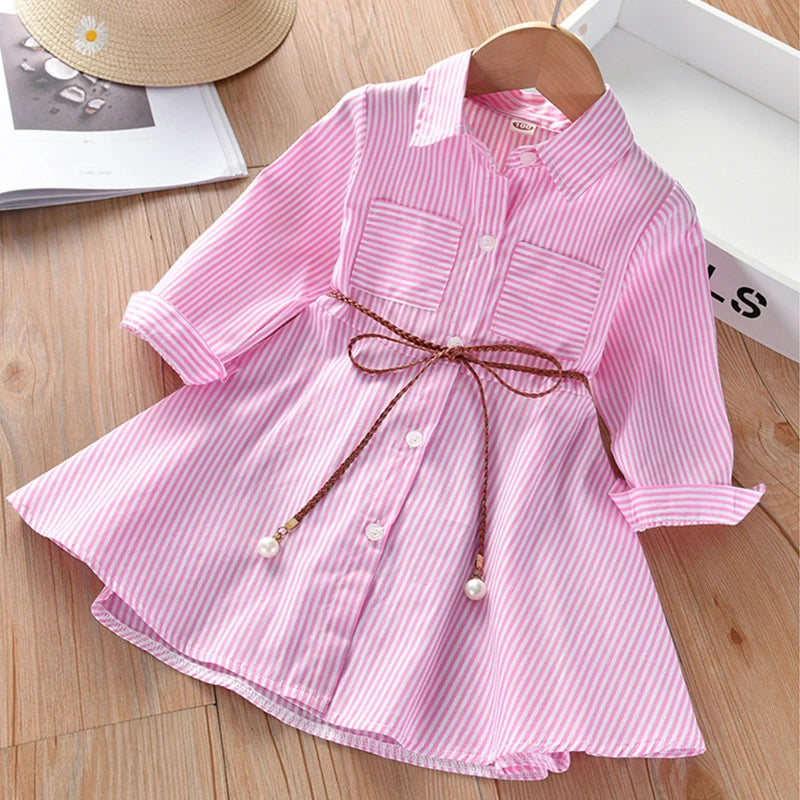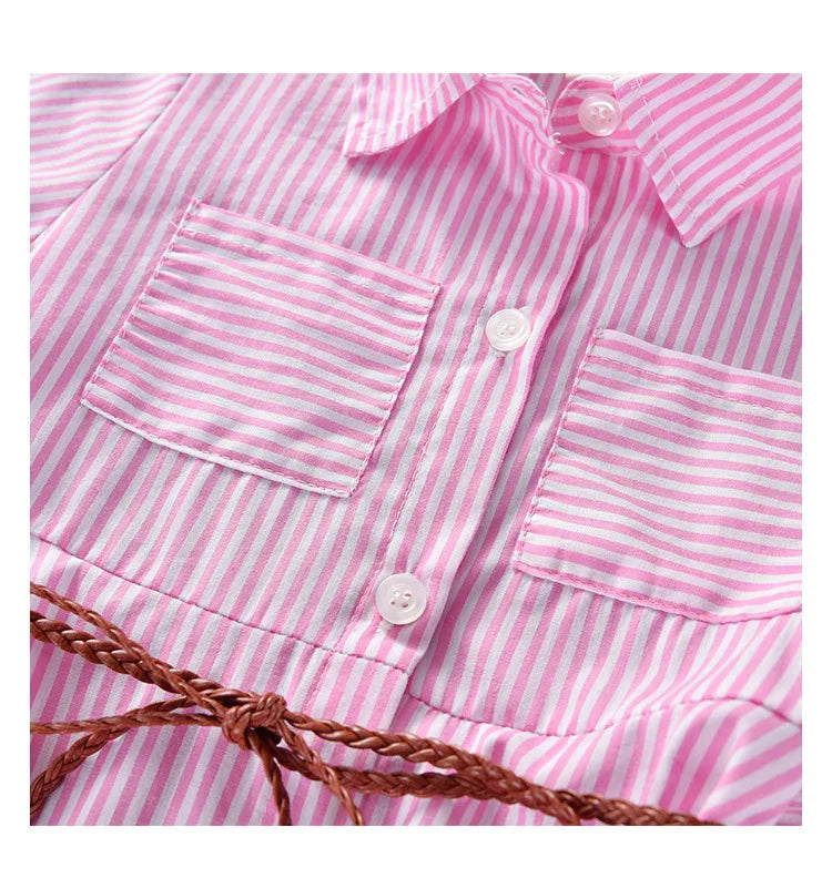 Kids Summer Single Breasted Shirt Dress Girls Casual Loose Pocket Striped Dress Fashion Chic Long Dresses Elegant Loose Belted