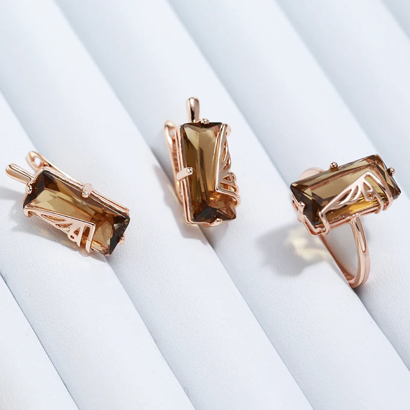 Kinel Hot Fashion Light Brown Natural Zircon Big Ring for Women Simple Square 585 Rose Gold Color High Quality Daily Jewelry