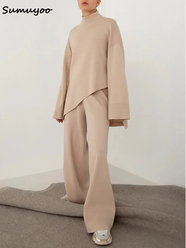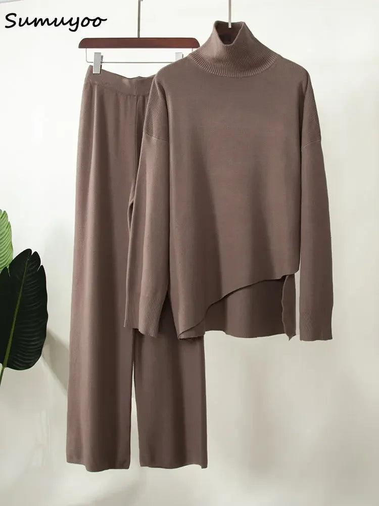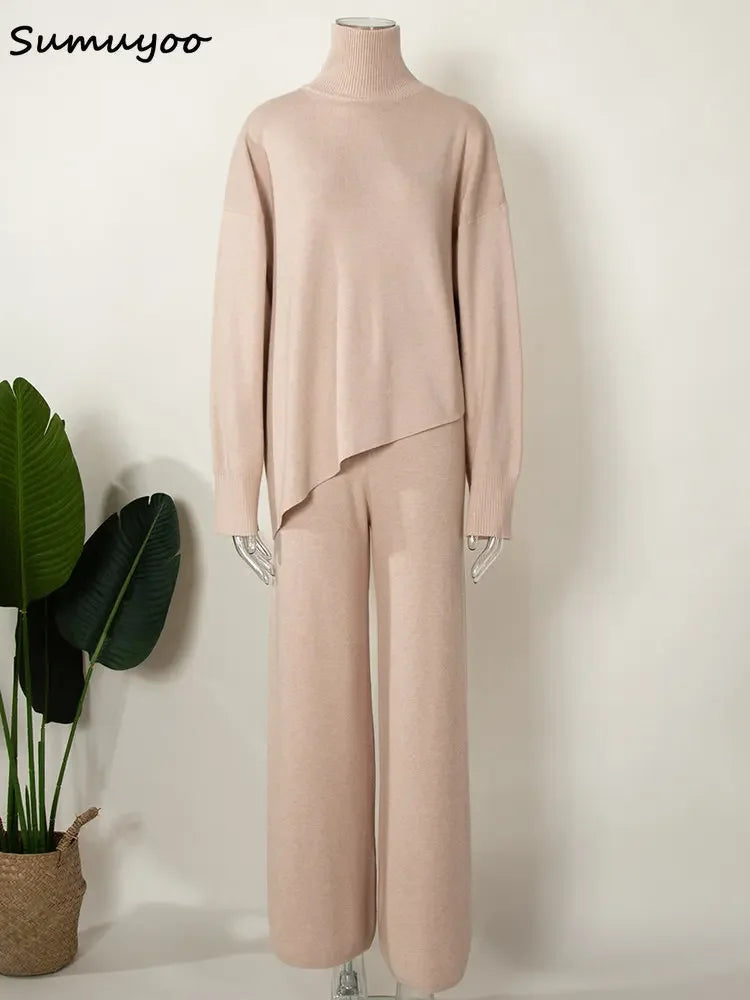 Sumuyoo Knitted Pant Sets Women Irregular Turtleneck Sweater Outfit Autumn Winter 2 Piece Sets High Waist Wide Leg Pant Suit