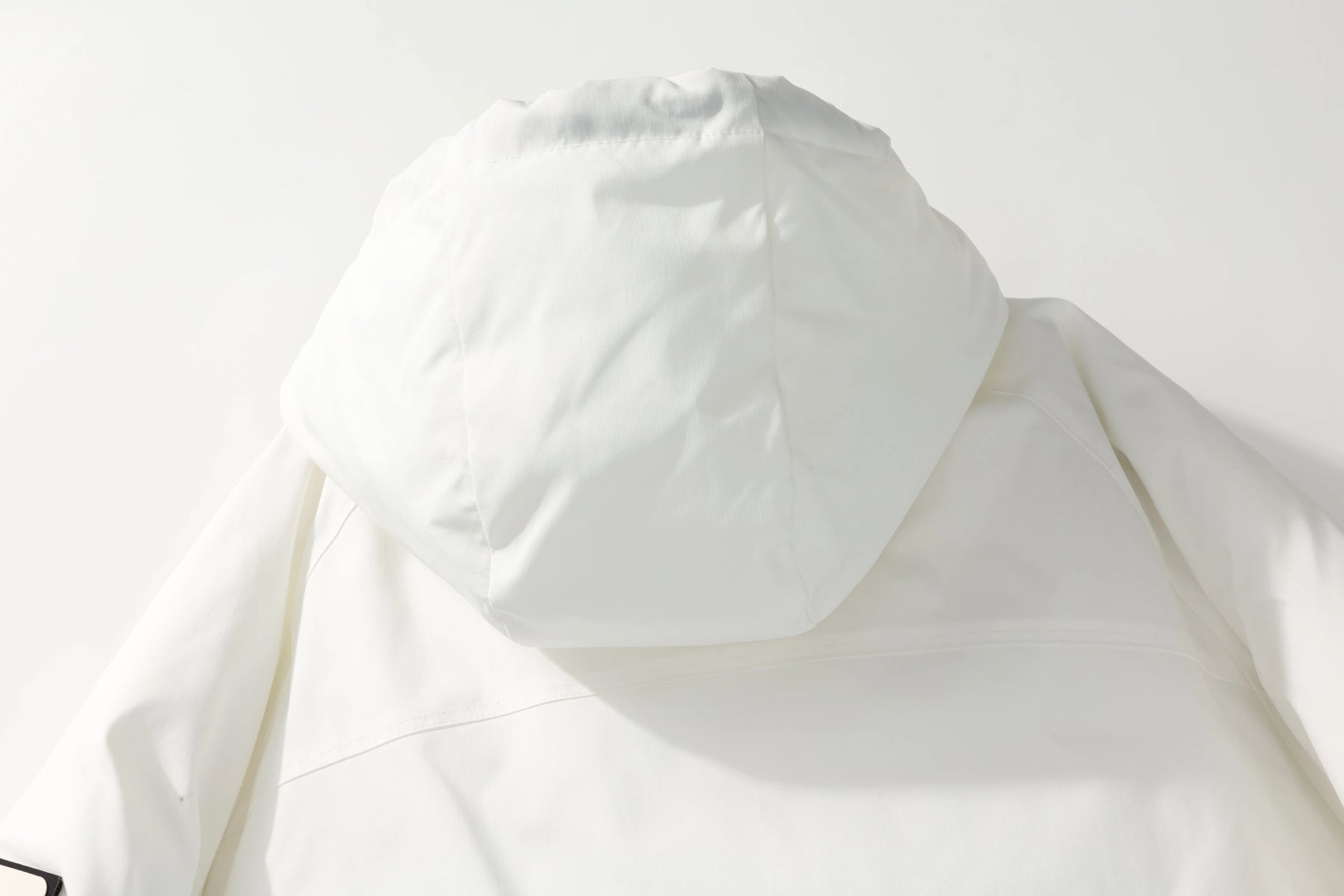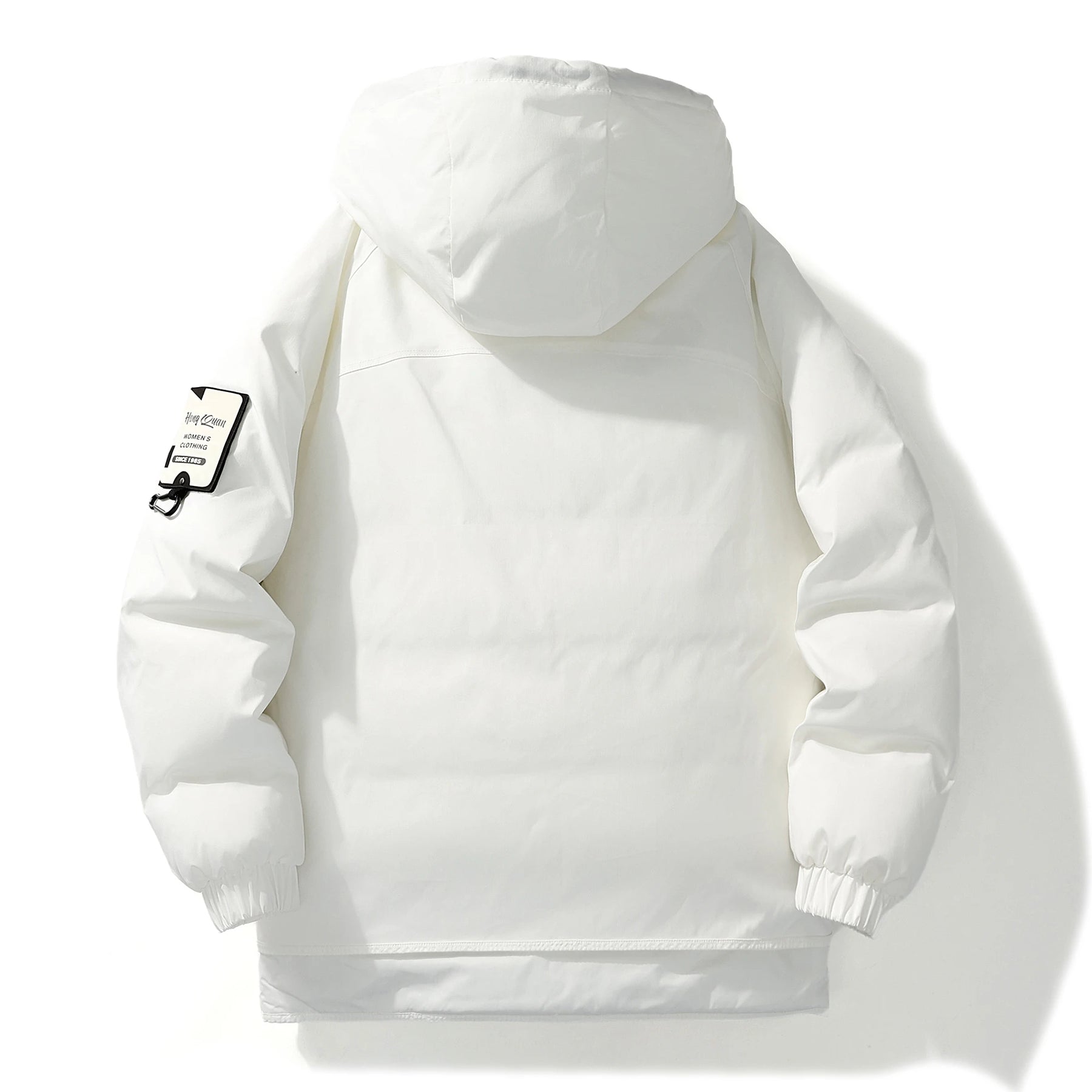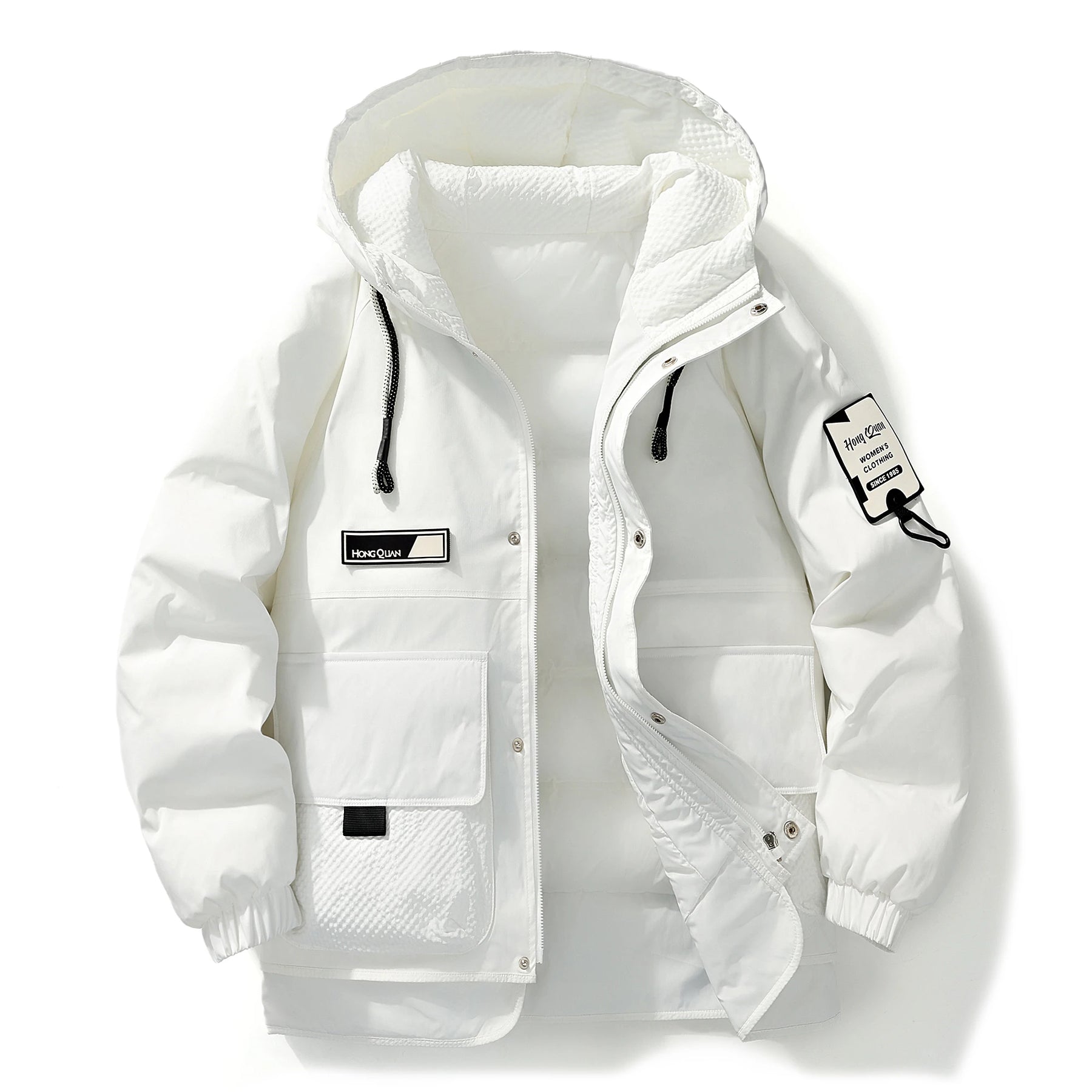White Winter Down Jacket for Casual Wear, Hooded Style, Unique Brand Labels, Wind - Resistant & Insulated