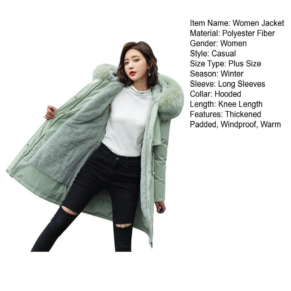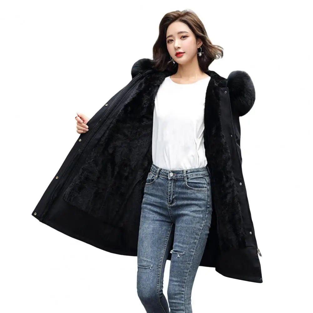 Winter Women Jacket Furry Hood Long Sleeves Pockets Knee Length Plus Size Zipper And Button Closure Thick Plush Lining Cotton Coat Mid Length Windproof Warm Coat