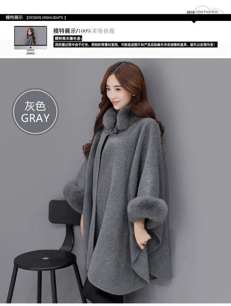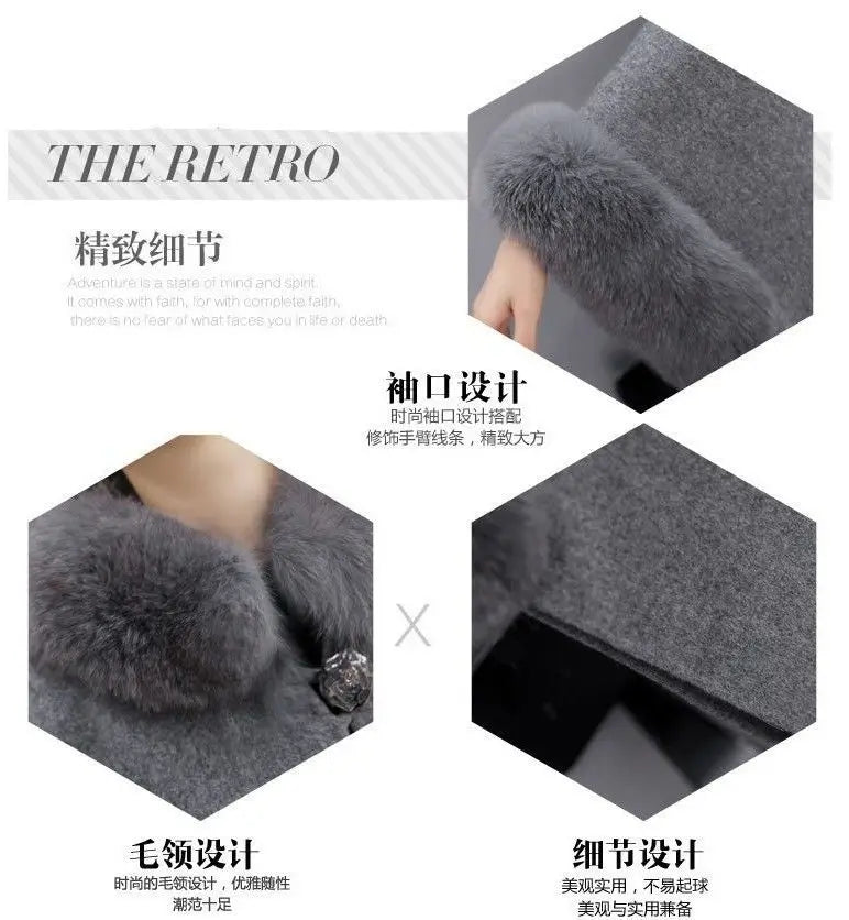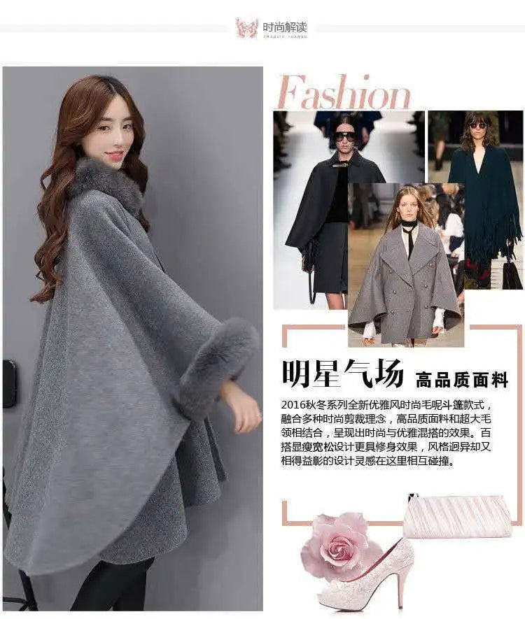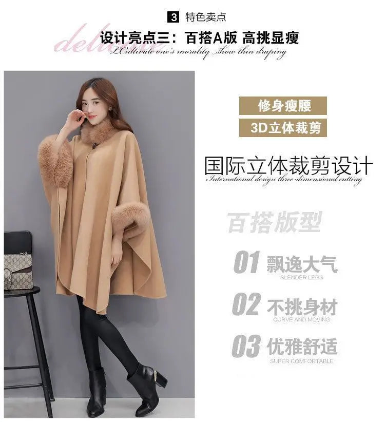 Women's Trendy Autumn and Winter Big Rabbit Fur Collar Mid-length Wool Coat Temperament Cape Shawl Hepburn Style