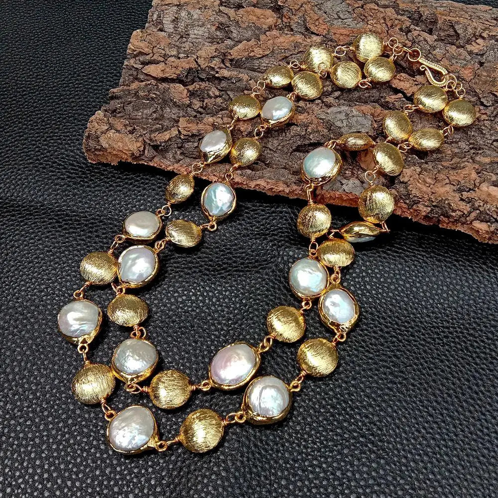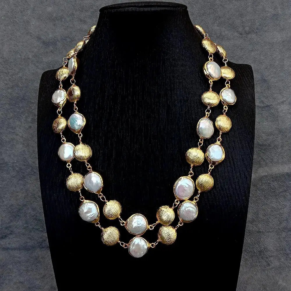YYGEM Freshwater Cultured 17mm White Coin Pearl 15mm Brushed Bead Necklace Multi Strands Luxurious Style Women Jewelry