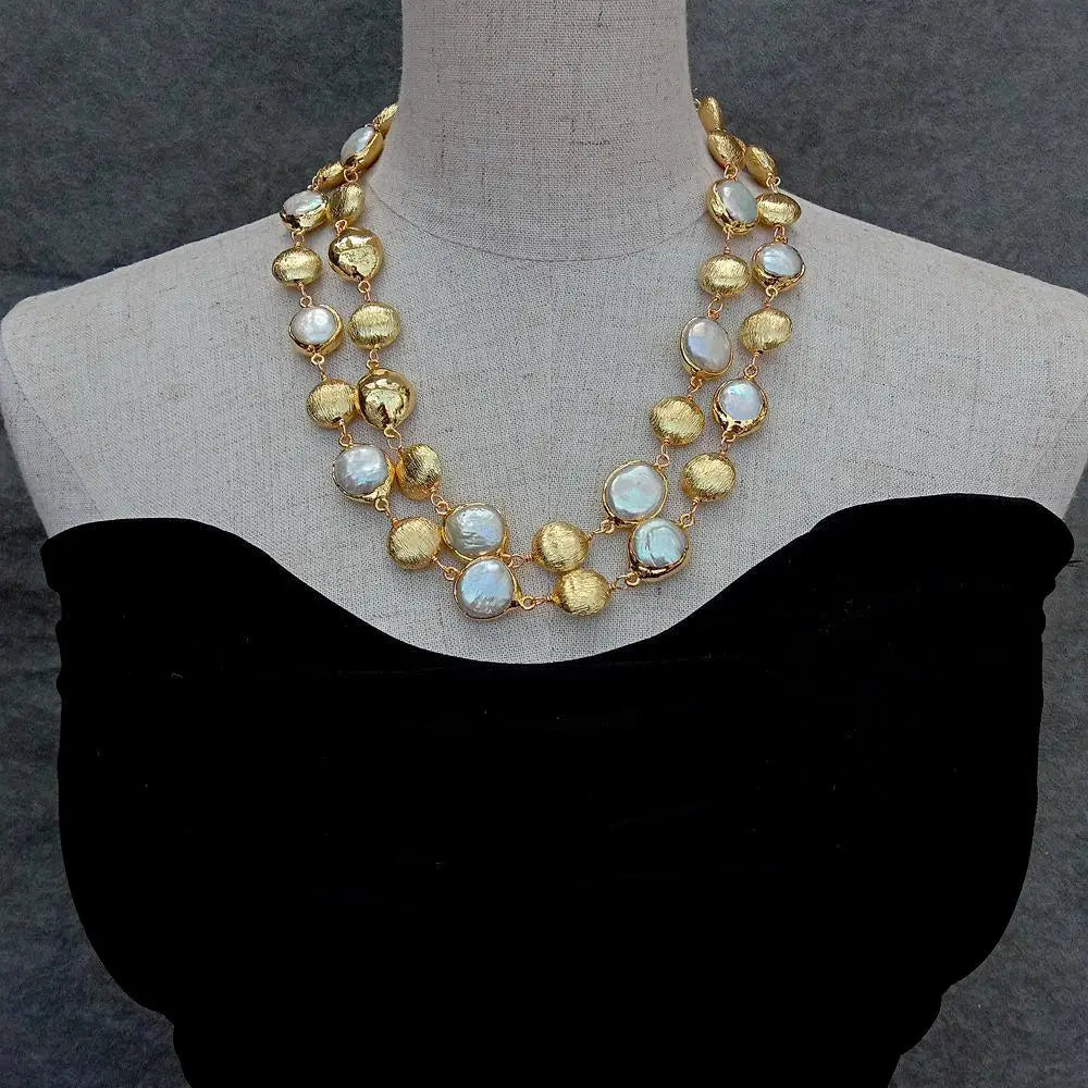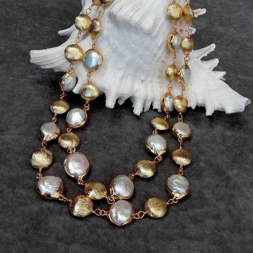 YYGEM  Freshwater Cultured 17mm White Coin Pearl 15mm Brushed Bead Necklace Multi Strands Luxurious Style Women Jewelry